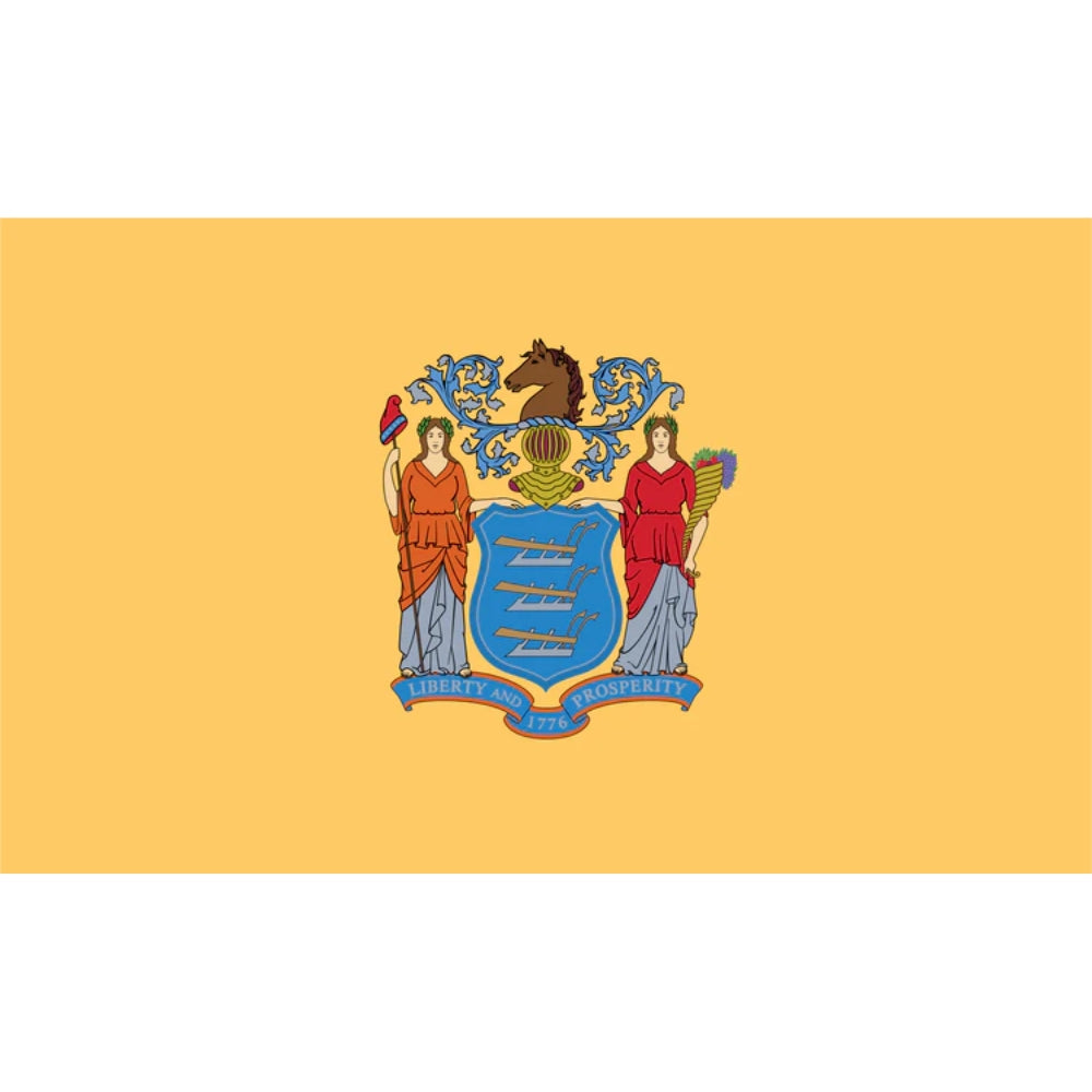 New Jersey's state flag, adopted in [year], proudly displays a design that represents the state's rich history and values. The flag features a deep blue field with the state coat of arms positioned at its center. Within the coat of arms, significant symbols embody New Jersey's identity and heritage. Flanking the cornucopia are two female figures representing Liberty and Prosperity. Liberty stands on the left side, holding a staff topped with a liberty cap, which is a symbol of freedom. On the right side stands Prosperity, depicted with a sheaf of wheat, symbolizing the state's agricultural wealth.