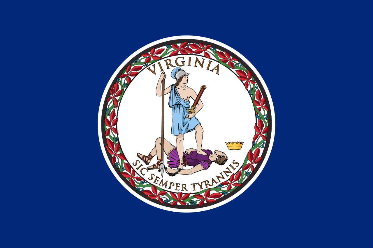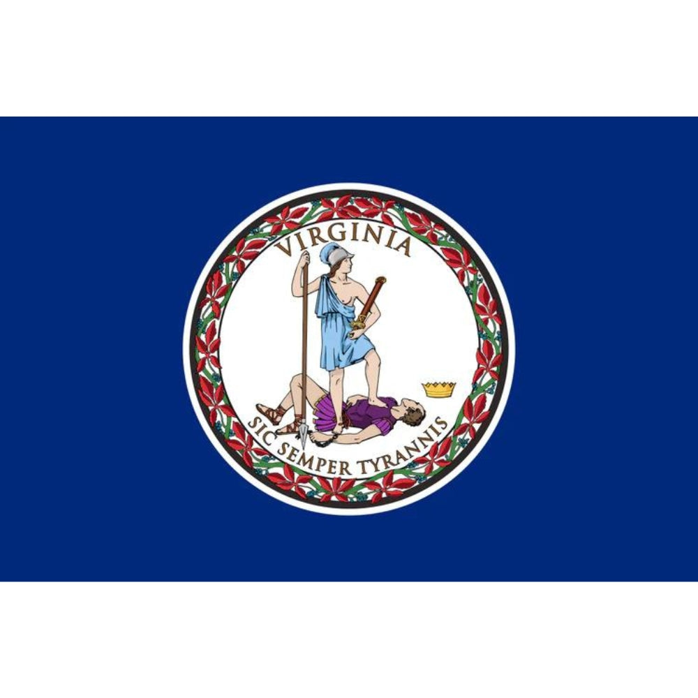 Virginia's state flag, adopted in 1861, features a deep blue field with the state seal at its center. The seal depicts Virtus, the Roman goddess of bravery, symbolizing Virginia's readiness to defend its principles. The flag's motto, "Sic Semper Tyrannis" (Thus Always to Tyrants), reflects the state's commitment to freedom and its significant historical legacy. It represents Virginia's enduring spirit and contribution to American history.