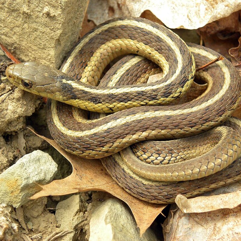The eastern garter snake's backs are dark brown, green, or olive-colored with a distinct yellow or white stripe running down the center. - History By Mail
